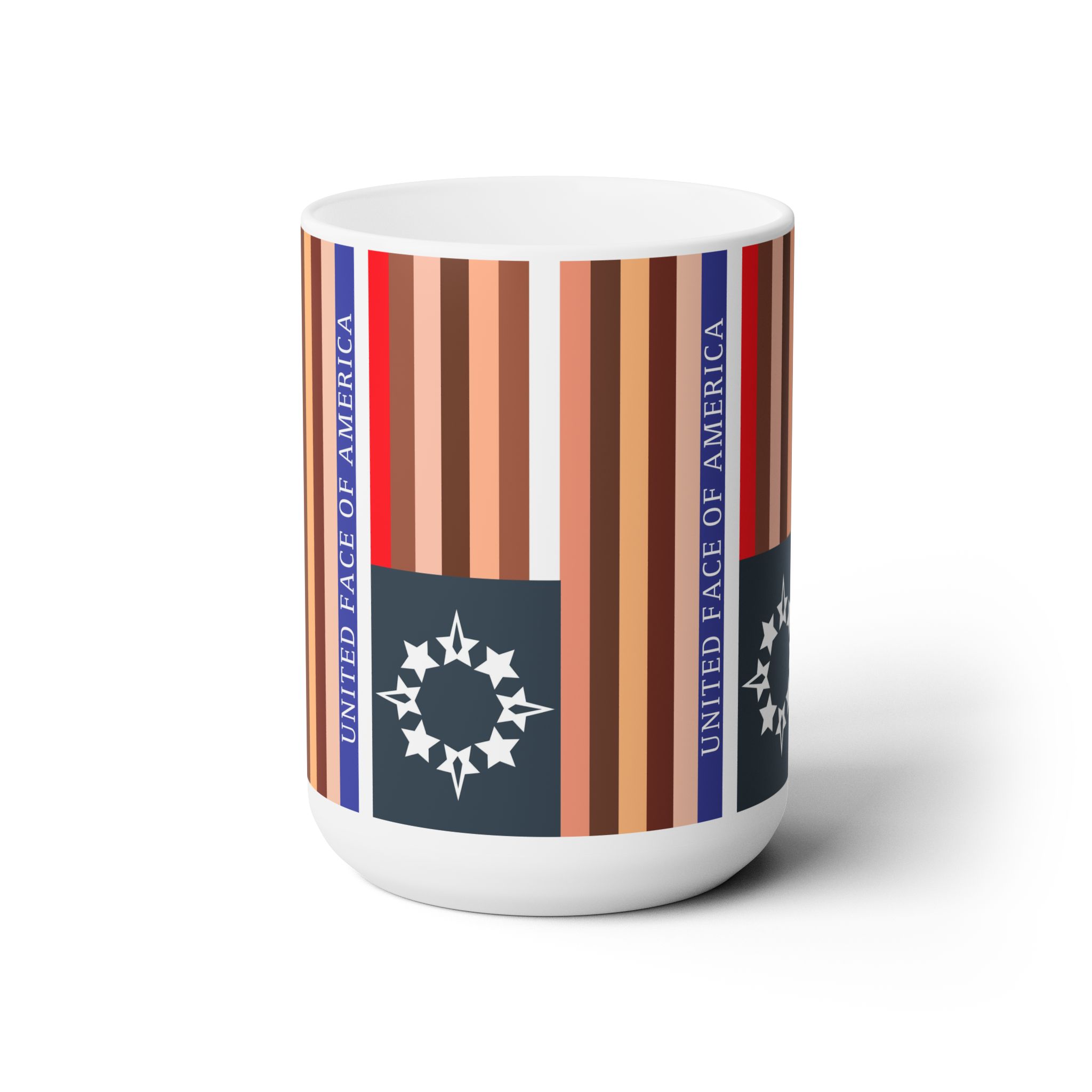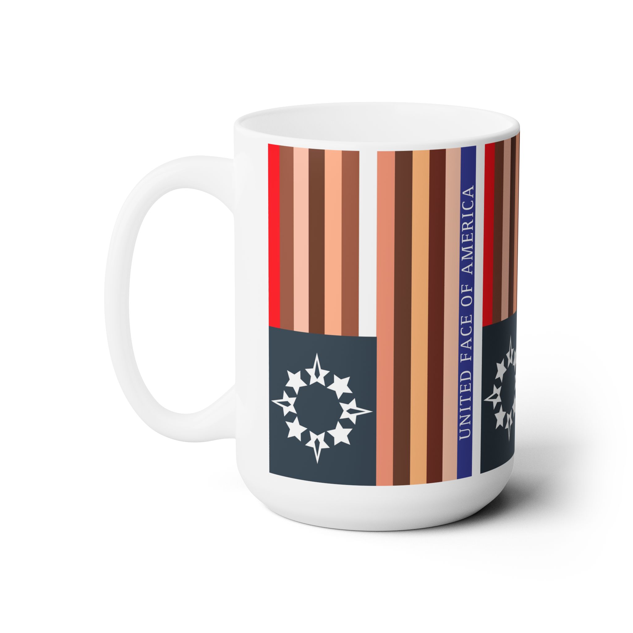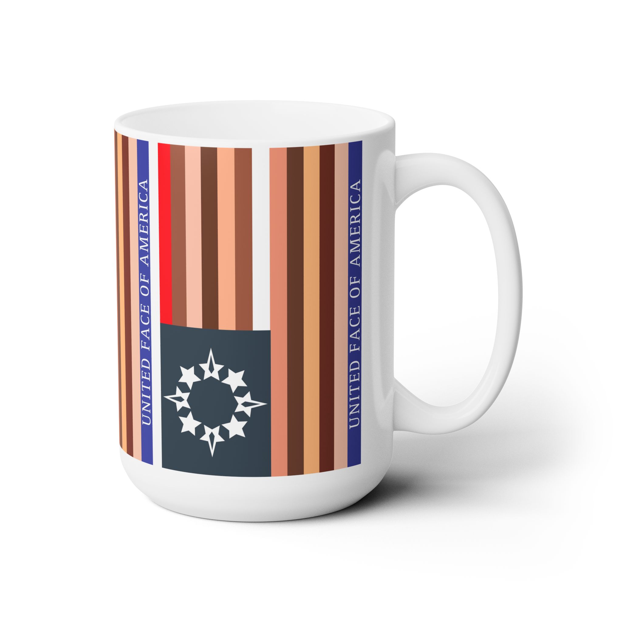 For something a bit different – a UFofA mug with Vertical flag stripes! Make a statement at work that you’re a creative who cares about our nation, and the respect of all the people in it – Good for you! Microwave and dishwasher safe, white ceramic, holds 15 fluid oz., C handles and rounded edges.